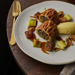 - Haggis Wellington: truffle mousseline, roasted swede, braised leeks & pickled girolles, lamb jus