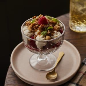 - Raspberry Cranachan: fresh raspberries & coulis, pistachio, hazelnut & maple crumble, whisky cream